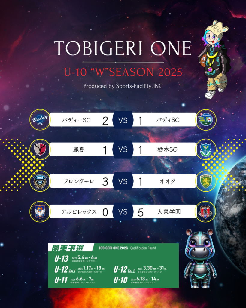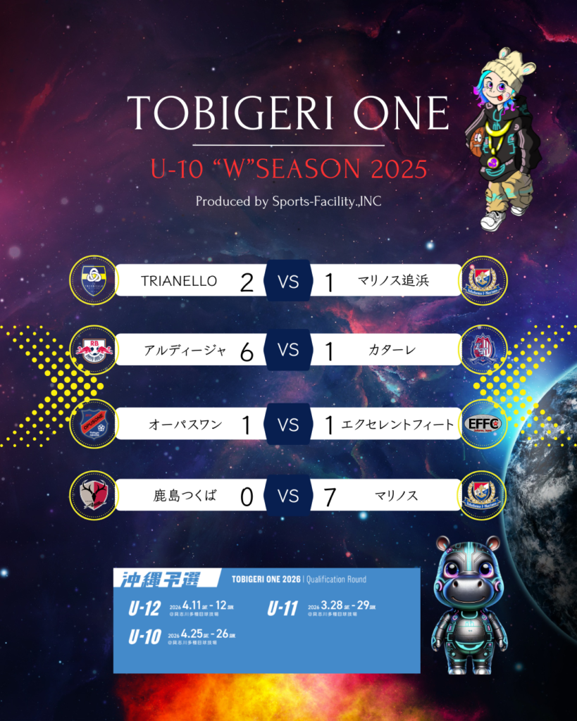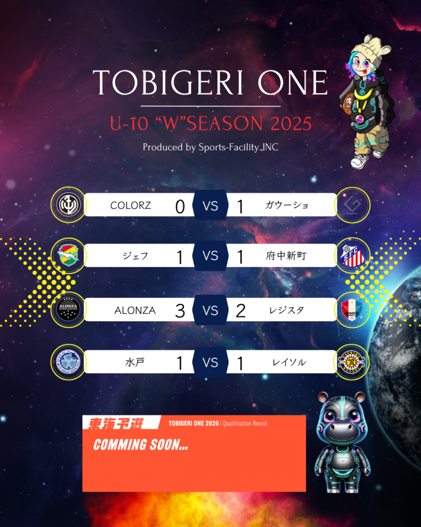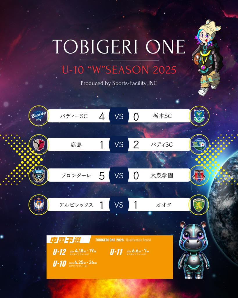 U-10 TOBIGERI ONE ”W” SEASON 2025 DAY1 結果速報🌟 1日目 予選結果速報 ダウンロードはこちら SNSアカウント \結果速報はTwitter/ \選手たちのリアルな様子はInstagram/ \大会終了後はYoutube/ \おもしろ動画はTiktok/ \テキスト速報&イベントの裏側はThreads/