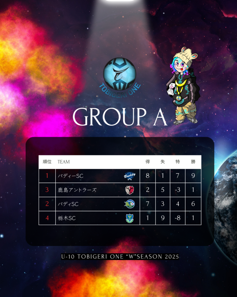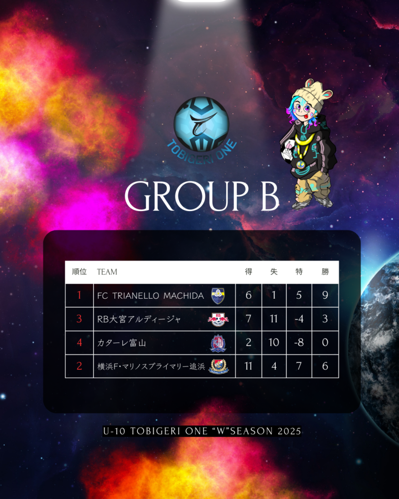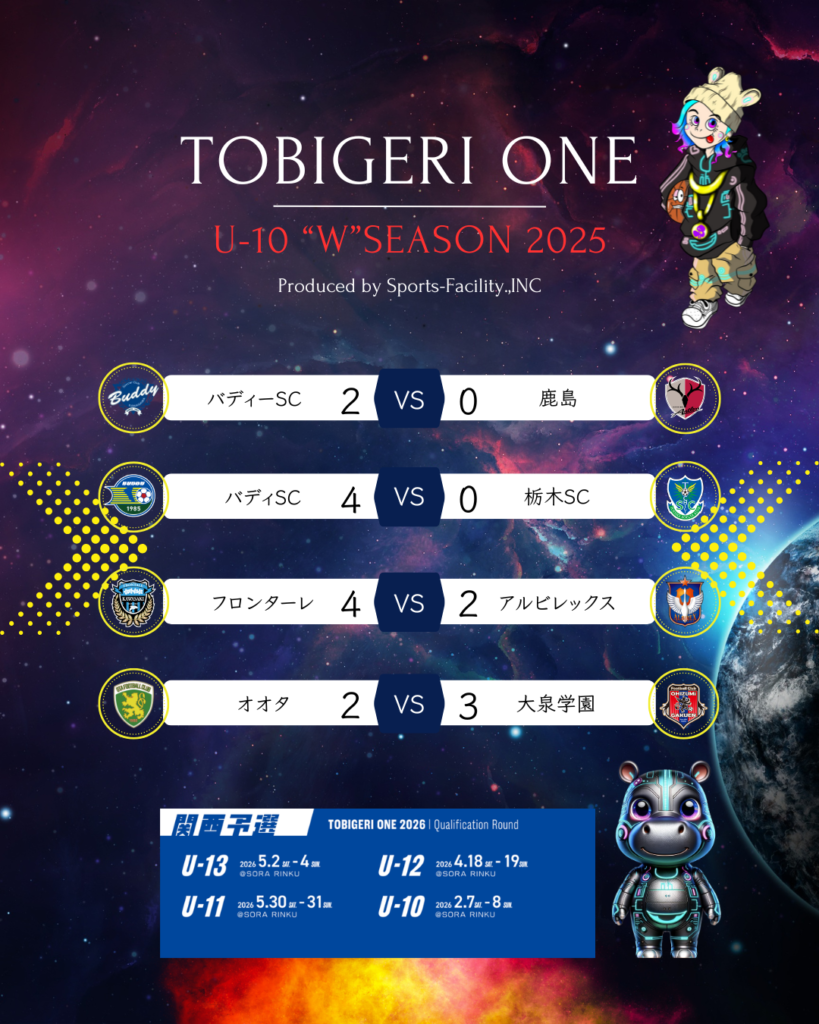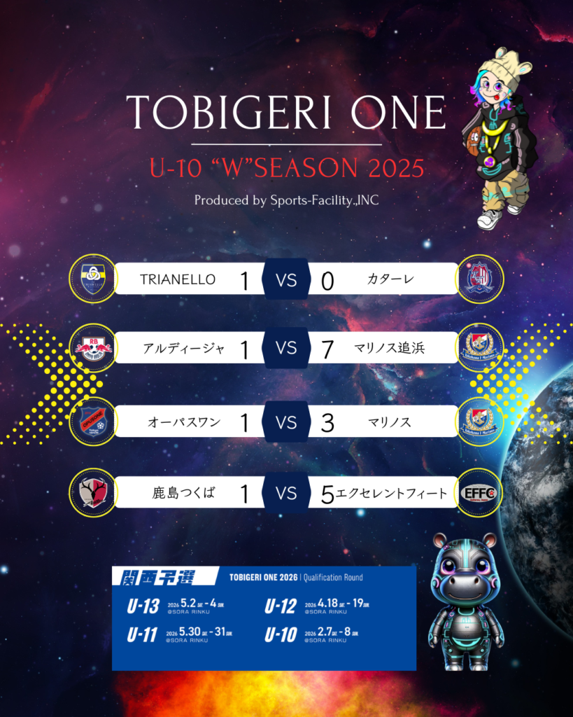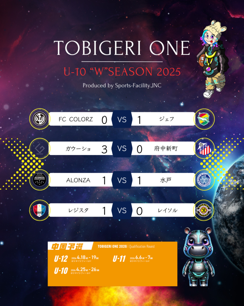 U-10 TOBIGERI ONE ”W” SEASON 2025 DAY1 結果速報🌟 1日目 予選結果速報 ダウンロードはこちら SNSアカウント \結果速報はTwitter/ \選手たちのリアルな様子はInstagram/ \大会終了後はYoutube/ \おもしろ動画はTiktok/ \テキスト速報&イベントの裏側はThreads/